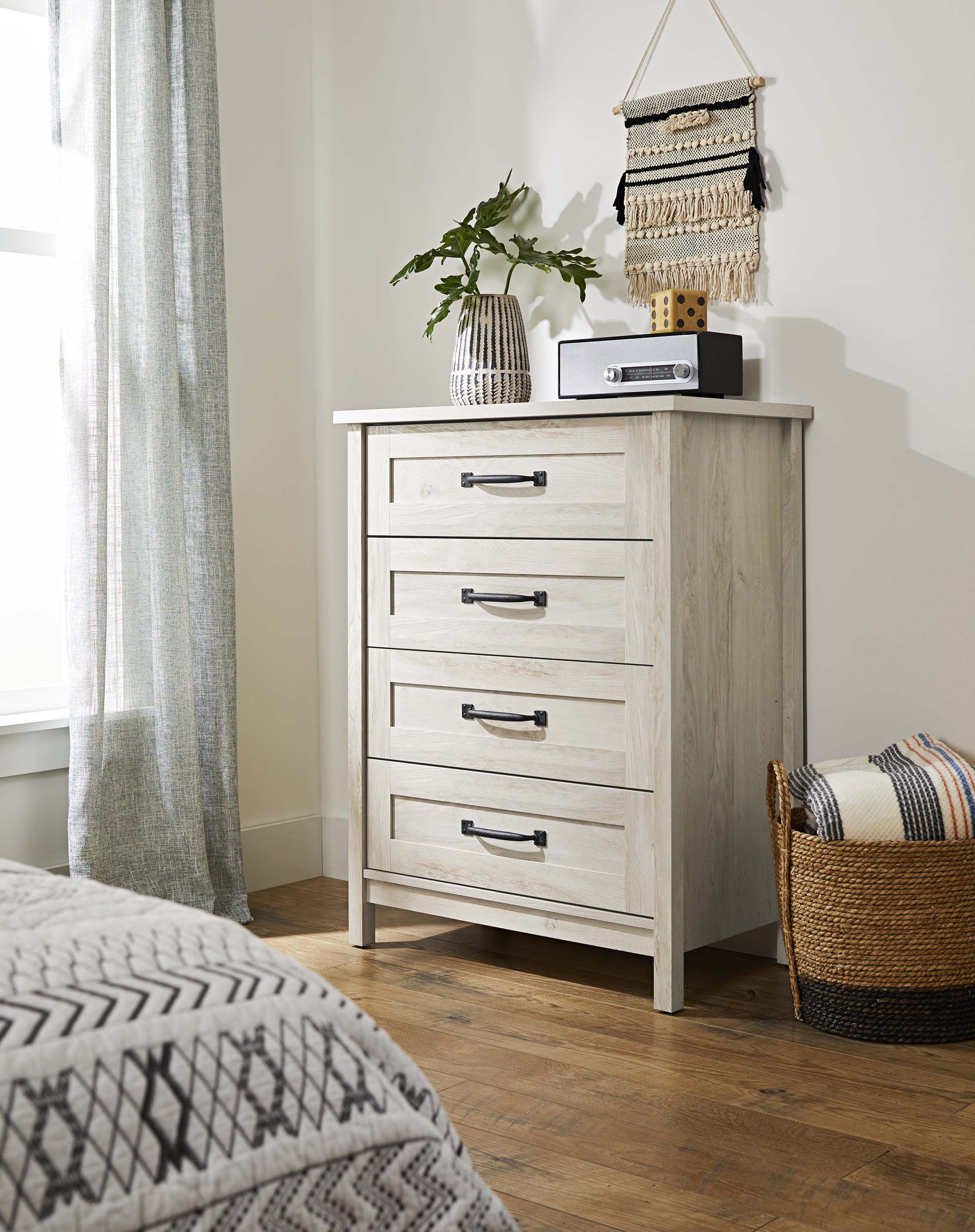 Style and functionality all in one! Give your bedroom the versatile storage options it needs without having to sacrifice the look you love with this 4-drawer chest from the Better Homes & Gardens Modern Farmhouse collection. This beautiful chest of drawers features four large drawers that open and close on smooth metal runners, creating the ideal spot for easy access storage of an array of different items like stacks of your favorite blouses and your collection of blue jeans to your secret stash of old t-shirts and comfy sweatpants. You can find a space for all your things! It also features a spacious top surface that provides you with room to store additional bedroom items and display home decor like an accent lamp, bottles of perfume, your makeup bag, and pictures of your family and friends too. Its framed panel doors and stylish hardware give this dresser a look that is sure to stand out in your bedroom. Finished in Rustic White, this stunning 4-drawer chest is the solution to all your storage woes.