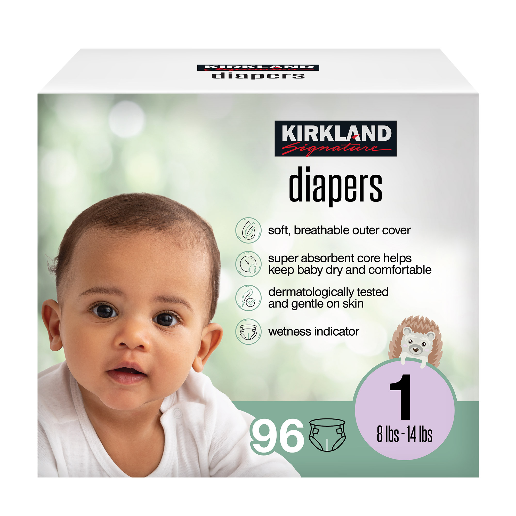 Kirkland Signature Diaper Size 1, 96-count, Thin by Design With Faster* Absorption, *Based on Third Party Lab Testing vs. Previous Kirkland Signature Design After Multiple Insults, Pocketed Waistband for Blowouts, Super Absorbent Core Helps Keep Baby Dry and Comfortable, Dermatologically Tested and Gentle on Skin, Wetness Indicator Turns Blue When Wet, Next Size Indicator